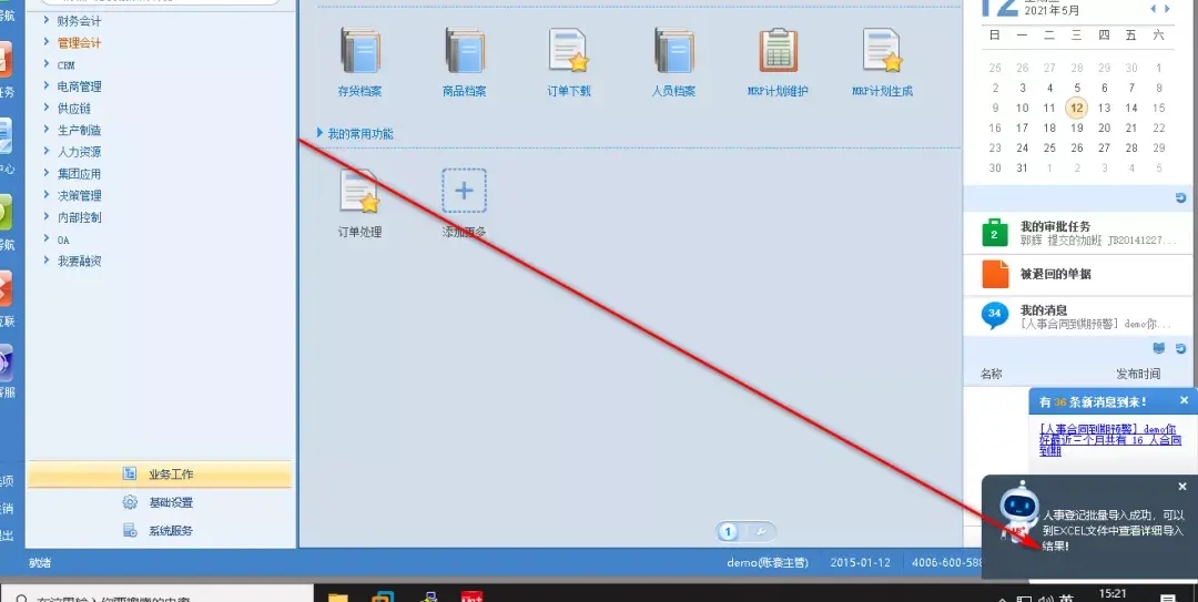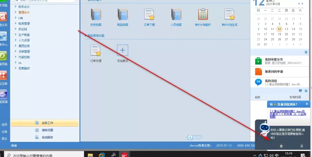 三、机器人运行 模板文件更新后,登陆U8,右下角机器人提示