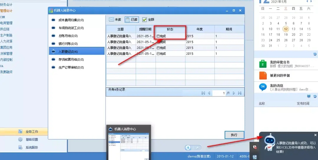 l 根据入职登记导入日志进行分析,如果导入文档有变化,机器人自动执行导入。
