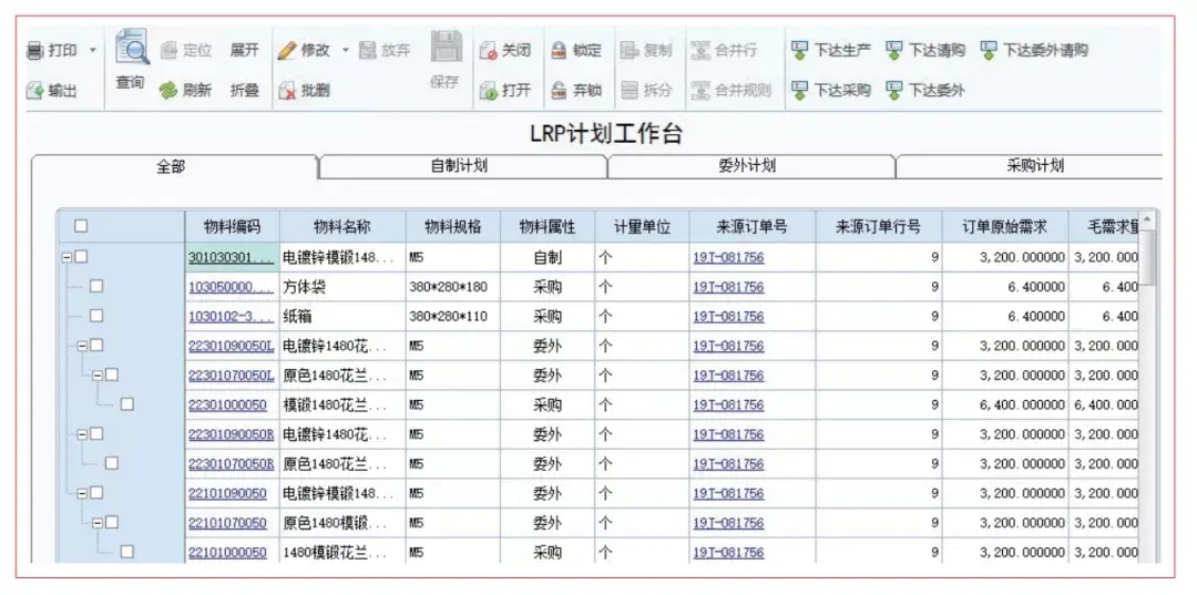 依据销售订单和BOM,通过LRP运算计算出需下达的生产订单,委外订单、采购订单,可以通过销售订单查询到相关的下游单据。