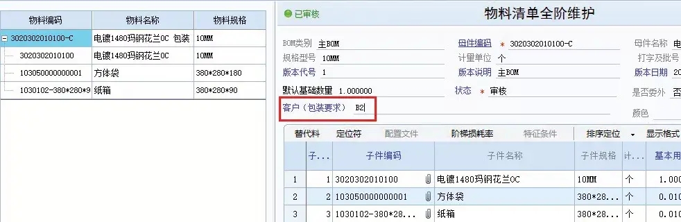 客户包装要求的结构性自由项的使用,达到同一存货针对不同客户不同的BOM来实现,不用加存货编码同时实现管理要求