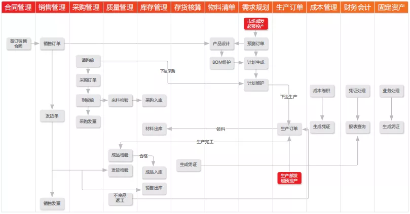• 生产计划人员进行 MRP 需求运算,并下达采购请购及生产订单,生产人员审核生产订单,并在完工后,按订单进行产品报检。