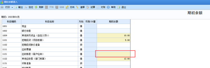 4.导入成功之后打开总账-期初余额界面去查看,发现只有应收账款科目没有显示期初余额;