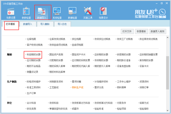 1.从实施导航里的数据导入-打开模板中点科目期初余额,打开模板。