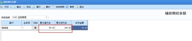 3.退出后在辅助期初余额界面,可以手工录入累计借方金额和累计贷方金额;