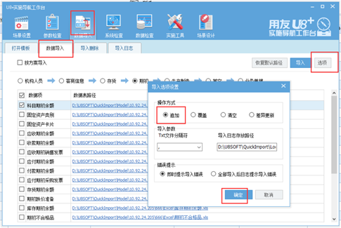 3.录入好模板并保存之后,再进行数据导入。操作方式选择追加。