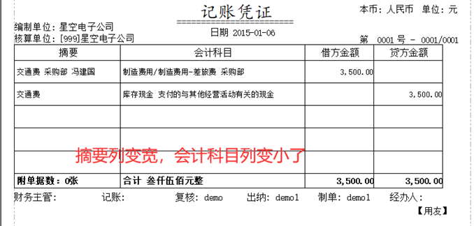 例:将摘要列宽调大,会计科目列调小 凭证打印-设置-详细格式设置-通用格式设置-表体,在表体各列的宽度调整数值。 数值排序按照凭证打印时的列对应。