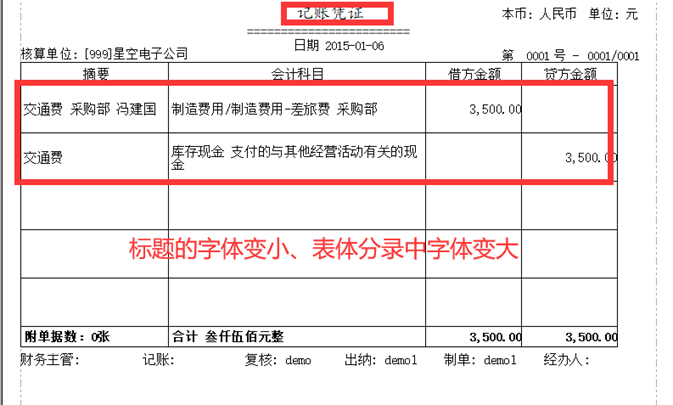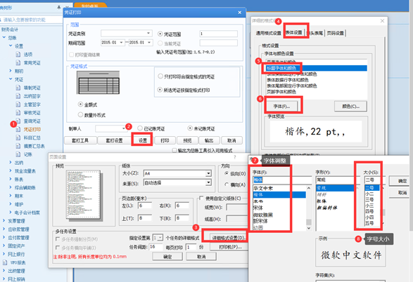 例:将标题“记账凭证”字体调小、分录的字体调大 1、 凭证打印-设置-详细格式设置-表体设置,标题字体和颜色-字体 2、 凭证打印-设置-详细格式设置-表体设置,表体数据行字体和颜色-字体