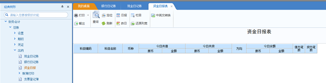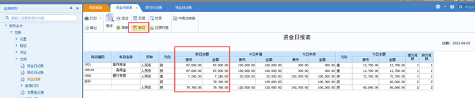 进入【财务会计】-【总账】-【出纳】-【资金日报】中选择好日期,可以查询到当天现金科目和银行科目的今日余额、今日共借、今日共贷、余额方向、借方发生凭证笔数、贷方发生凭证笔数等情况。