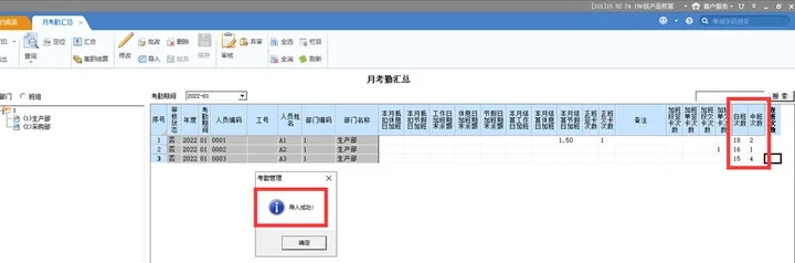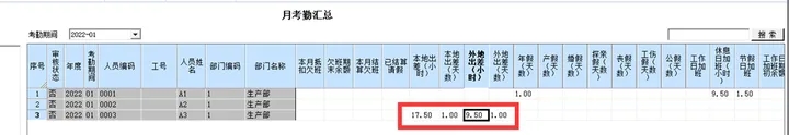 3、月考勤汇总中,汇总操作的数据来源于考勤日报,核对迟到、请假、早退、加班等数据时,可以查看考勤日报的数据,其中,外地出差(小时)取的是日报里的出差1、出差2这些数据相加之和,不是取出差(小时);