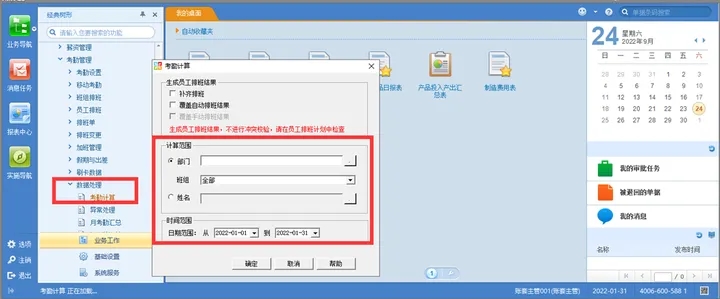 1、【数据处理】-【考勤计算】,选择计算范围和计算时间(选择本月),点“确定”,弹出提示:“日结果计算成功”