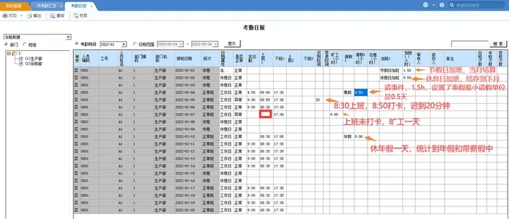 如A1人员本月有迟到、早退,加班、请假、出差等数据可以直接到考勤日报里查看明细记录,