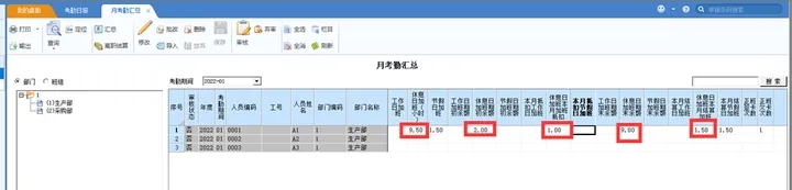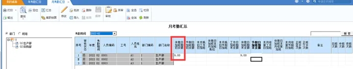 【数据处理】-【月考勤汇总】,点“修改”,如修改A2的调休期末余额为10,点“保存”