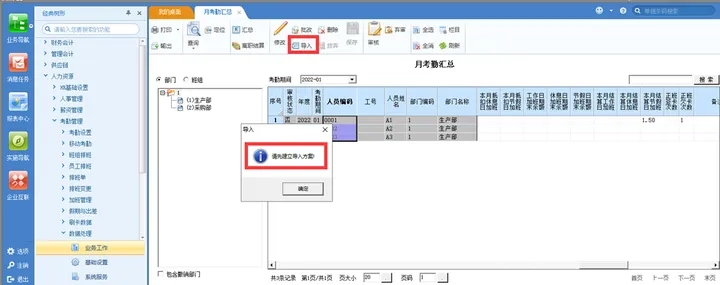 A、【数据处理】-【月考勤汇总】,点“导入”,弹出提示“请先建立导入方案”,点“确定”