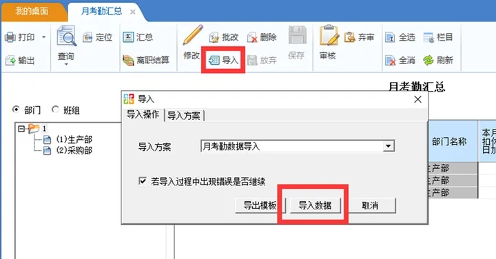 G、【数据处理】-【月考勤汇总】,点“导入”,弹出导入界面,选择“导入操作”页签,点“导入数据”导入数据,选择导入模板,点“打开”