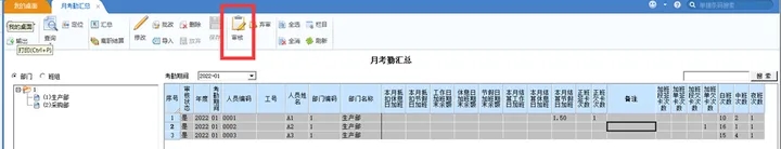 6、确认月考勤数据无误后,点“审核”,审核后,数据变成灰色,无法修改、批改、导入来调整数据
