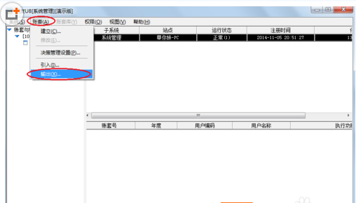 2、在“系统管理”窗口中,选择“账套”菜单,在下拉列表中点击“输出”。