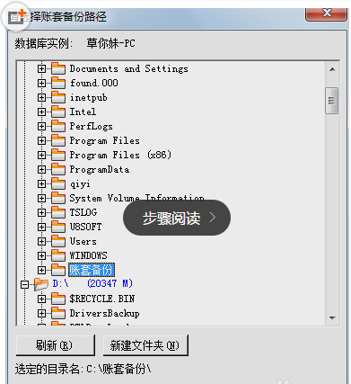 4、“输出文件位置”则选择备份文件需要储存的位置,点击该编辑栏右侧的“…”按钮(见上一步骤图),弹出“请选择账套备份路径”对话框,系统默认的备份路径是安装用友软件的路径,可以自行设置,例如设置备份在C盘的“账套备份”文件夹中,完成后点击“确定”。