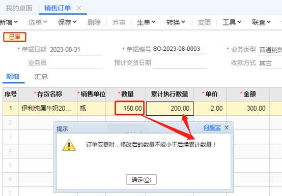 4、还有一种情况也说明下,销售订单数量是200,已出库了200,此时客户说不要那么多只要150,这时候我们变更订单数量为150是不允许的,如图下提示,因为出货已经出了200,订单数量不能小于200只能大于等于200。如果非要改订单数量只能删除出货单,再返回来修改销售订单数量。