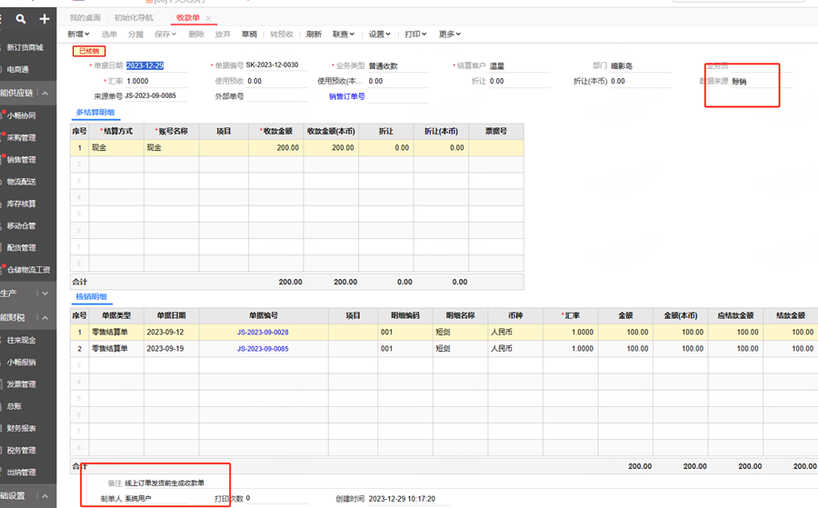 该单据为赊销单据,所以显示为系统用户,只要是赊销的业务,生成的收款单制单人都是系统用户