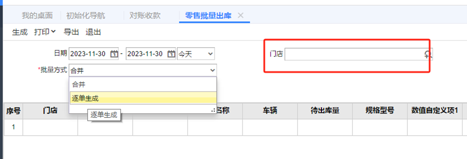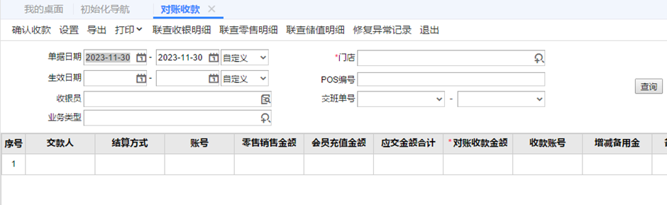2.2查看账套的门店档案是否正常有这个pos的数据在零售数据中心是没有结算和出库的,如果有,则操作下【对账收款】这个门店的对账收款和【零售批量出库】,选择逐单生成