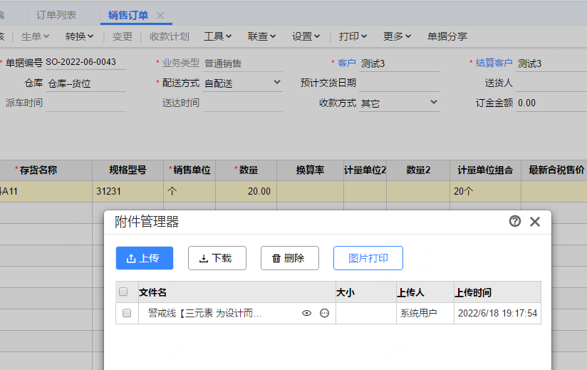 2、在订货商城下带附件的单,T+内确认订单,可以在销售订单的附件中看到上传的附件,