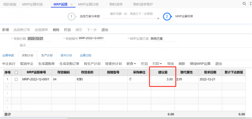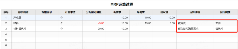 本次MPR运算,【材料】的替代件【材料替代件】充足,故【产成品】10个直接用了【材料替代件】;但因【材料】在运算前就是-3个,故本次运算,采购计划单独对【材料】进行了采购建议。