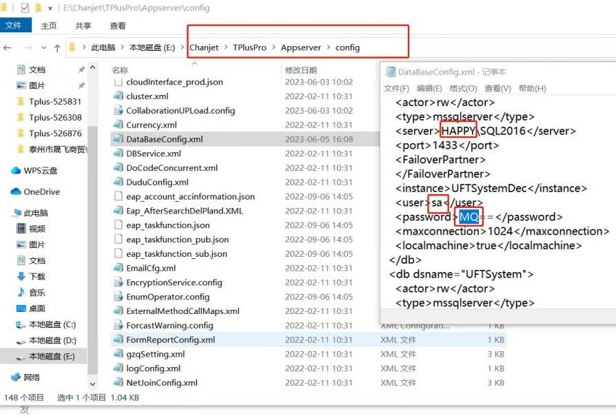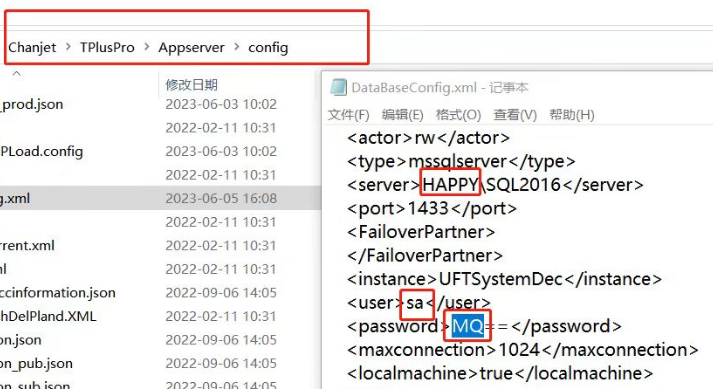 4.软件安装路径下的Chanjet\TPlusPro\Appserver\config文件夹打开,找到DataBaseConfig用记事本打开,里面的计算机名称、数据库密码错误了,也会导致创建系统库失败。