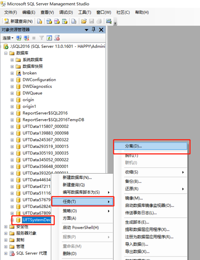 1.点击安装T+软件的服务器桌面【开始】-【所有程序】-【SQL server management studio】,进入数据库,在左侧列表中找到T+的系统库【uftsystem】,右击【任务】-【分离】,即可将系统库分离;