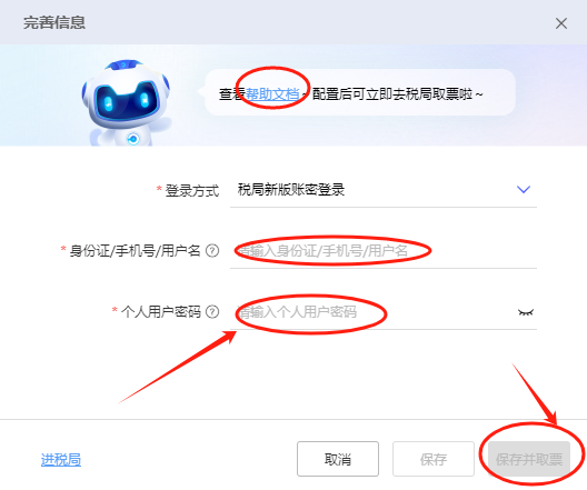 完善信息界面需要输入的是电子税务局的登录账密,如果不清楚需要输入什么节点的账号密码,此界面点击【帮助文档】可以查看各报税地区,具体填写的信息。