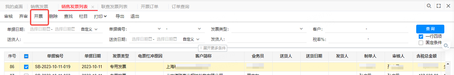 1、打开开票单据(销货单/销售发票),点击右上角【查找】进入开票单据列表。