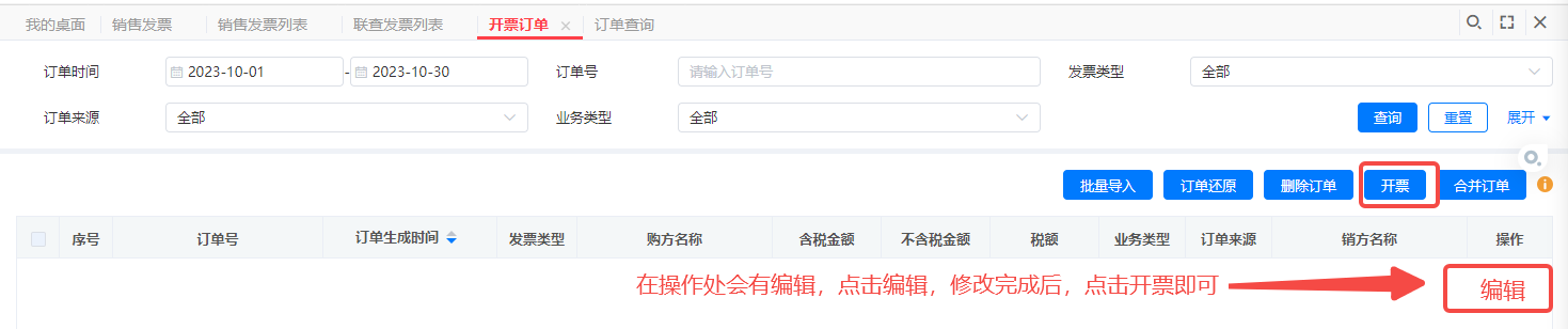 3、发票管理-开票订单,找到之前单据生成的开票订单。点击【编辑】修改保存之后再重新提交开票即可。