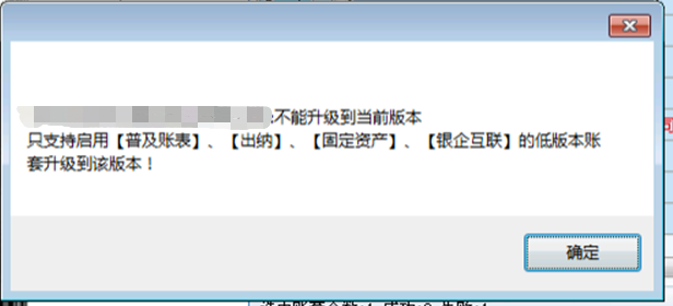 只支持启用[普及账表] 、[出纳] 、[固定资产] 、[银企互联] 的低版本账套升级到该版本 !