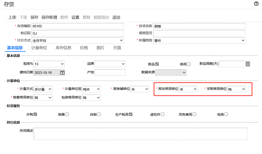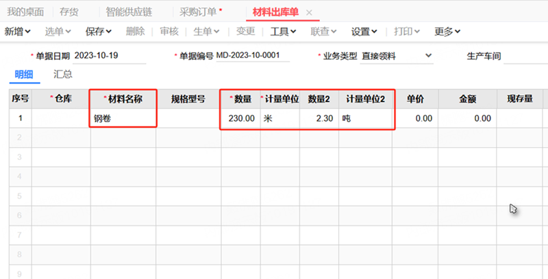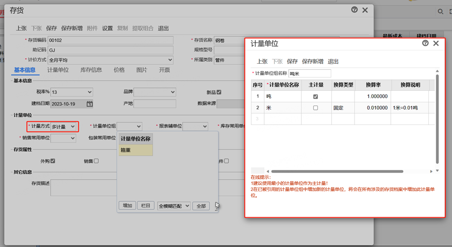 机械加工行业,一些原料是按照吨购买,但生产领料是按米出库,此时就需要通过设置多计量来解决这个问题。