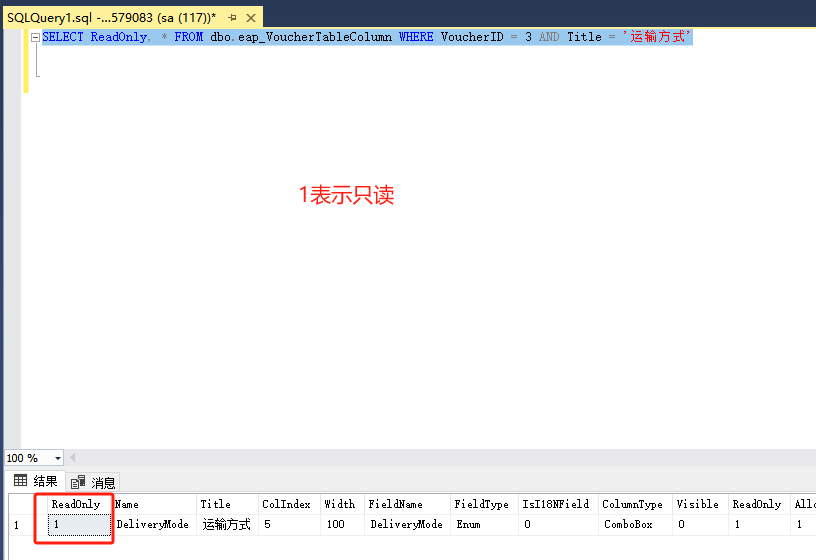 1、用下面语句查询往来单位运输方式字段在数据库中的readonly是0还是1