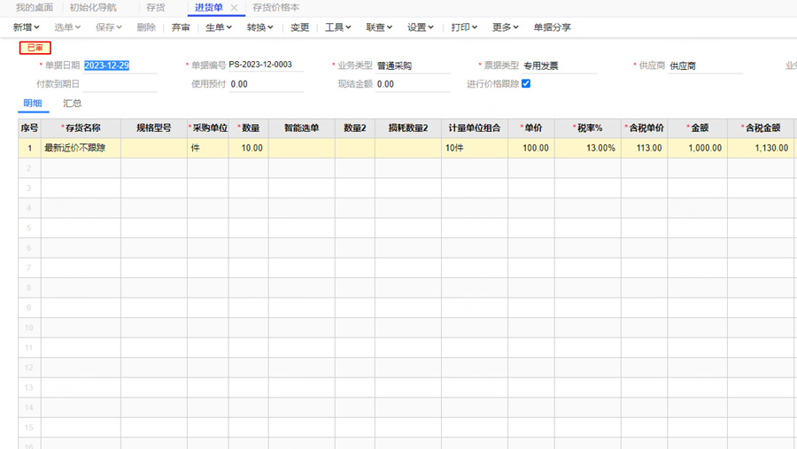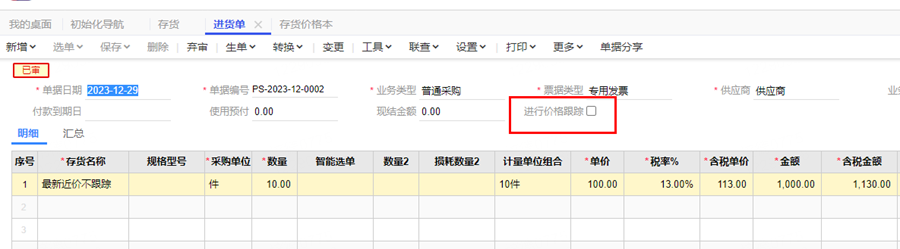 查看进货单上进行价格跟踪没有勾选。