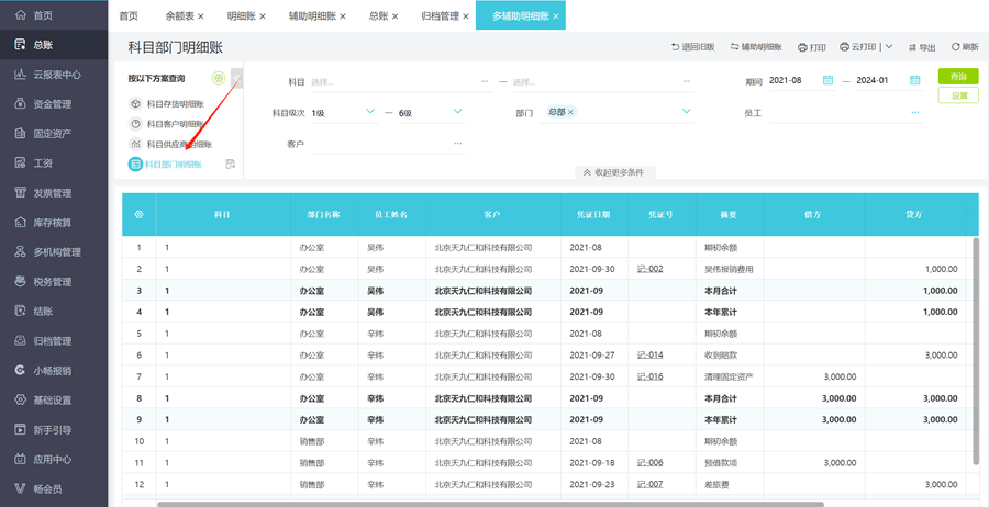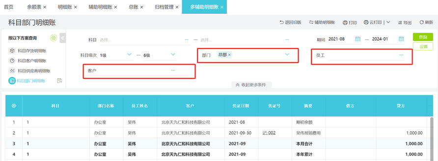 返回到科目部门明细账界面,可以看到出现【部门】、【员工】、【客户】辅助核算,根据这些可以筛选对应条件,可以将多辅助核算查询在一张表中