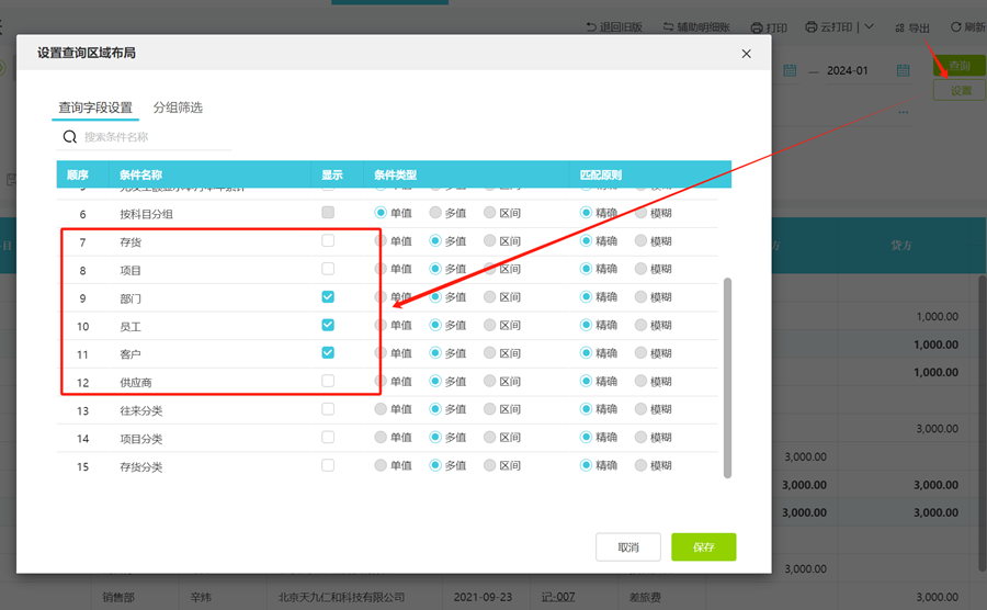 点击【设置】,会出现【设置查询区域布局】,勾选所需要的辅助核算显示,然后点击保存。