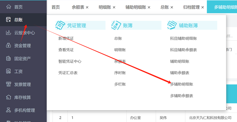 多辅助明细账或者余额表查询:以多辅助明细账为例,右上角选择其中之一方案来查询,例如科目部门明细账。