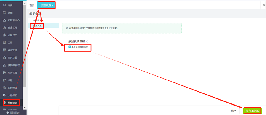 1.进入系统,点击基础设置-安全设置-安全设置-勾选重要字段脱敏展示-保存刷新。