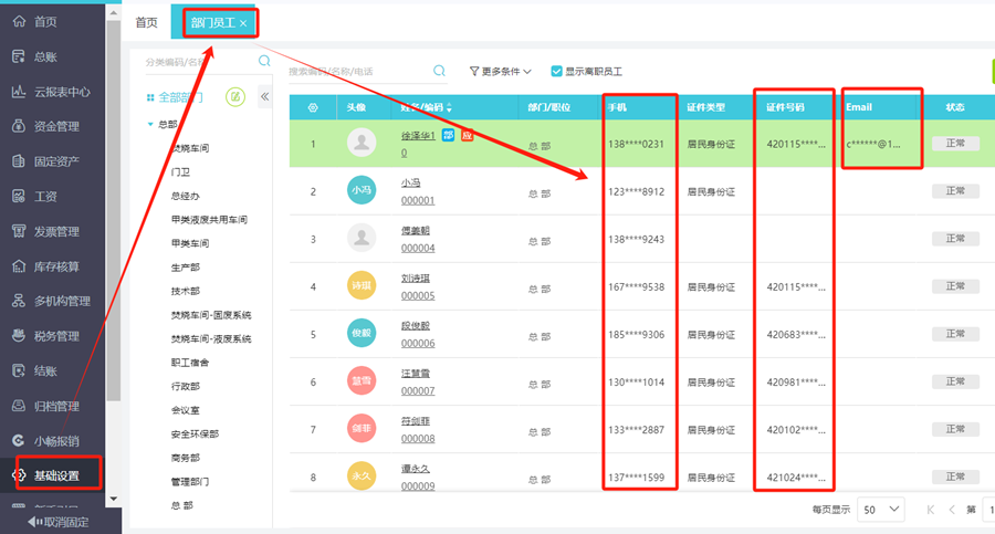 2.进入基础设置-部门员工查看,员工手机号、证件号、邮箱号中间几位全部会隐藏。