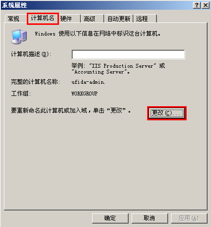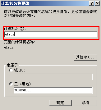 2、在计算机名称下输入计算机名(注意:8位以内的英文字母,如ufida,cw,admin等都可以,但千万不要包含特殊符号,中文等),修改好后点击“确定”按钮。如下图所示: