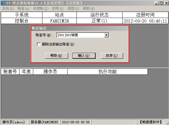 将现有账套001进行备份(进入系统管理,点击账套下的备份)