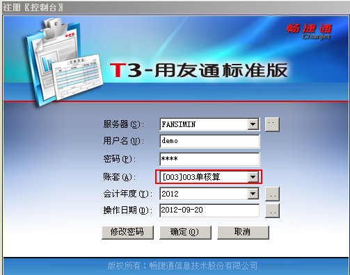 设置好账套主管后,登入用友T3时可以选到ZT003
