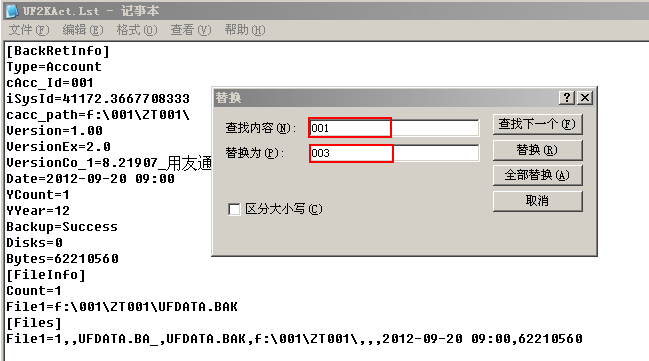 以记事本的方式打开ZT003输出文件中的UF2KAct.Lst文件,点击编辑下的替换,将001替换为003,并将该文件保存