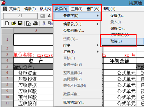 3、依次点击菜单栏上“数据”—“关键字”—“取消”: