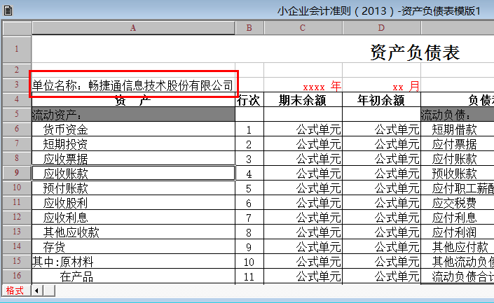 5、直接在报表中需要显示单位名称的单元格内录入单位名称,例如:畅捷通信息技术股份有限公司:
