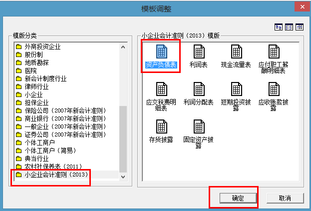 2、左边模板分类选择对应的行业性质,右边选择要调整的报表模板,点“确定”: