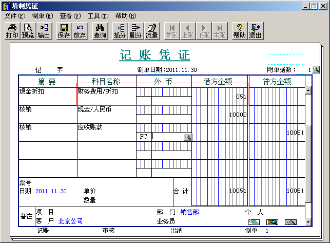 5、制单。点击“核算管理”—“客户往来制单”—“核销制单”,选择本业务进行制单,生成凭证中0.51的折扣金额计入财务费用。