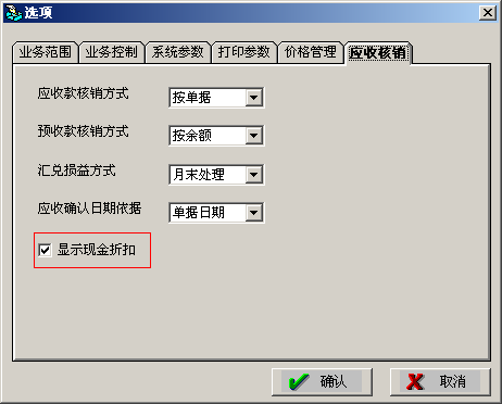 3、启用销售折扣功能。由于收款单金额和发票金额不一致,核销后会剩余0.51元,如此需要使用折扣功能,点击“销售”—“销售业务范围设置”—“应收核销”页签勾选“显示现金折扣”功能;