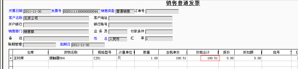 1、生成一张销售发票,销售给客户一件商品,价税合计为100.51元;
